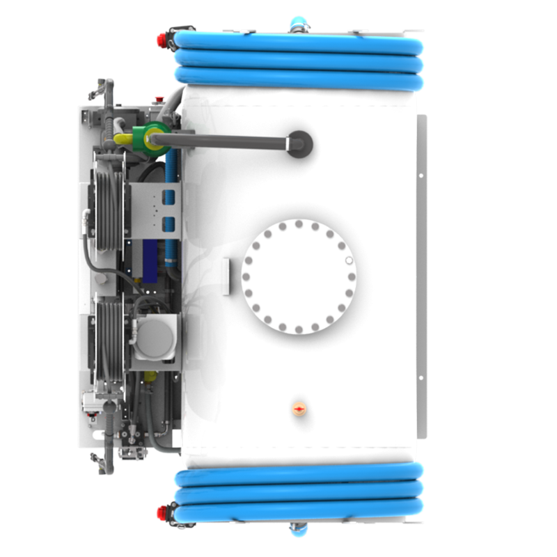 TRK vacuum tank units come as standard with an electronic and remote control system that allows faster operations at distance from the vehicle, a reduced capacity oil tank to minimize their weight, an air-oil heat exchanger that avoids the overheating of the hydraulic oil and optimizes the thermal range of the hydraulic system operations, lights to work easily in dark places or at night, and an hour counter device that indicates the time of use of the units.